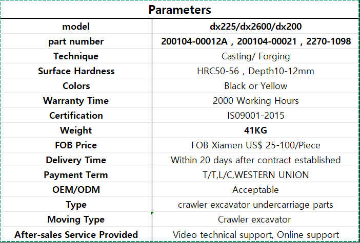 Parametreler model E395F parça numarası 300-4611/242-4066 Teknik Döküm/Dövme Yüzey Sertliği HRC50-56, Derinlik10-12mm Renkler Siyah veya Sarı Garanti Süresi 2000 Çalışma Saati Sertifikasyon IS09001-2015 Ağırlık 65 KG FOB Fiyatı FOB Xiamen 25-100 ABD Doları/Adet Teslimat süresi Sözleşmenin imzalanmasından sonraki 20 gün içinde Ödeme Şartları T/T, L/C, WESTERN UNION OEM/ODM Kabul edilebilir Tip paletli ekskavatör alt takım parçaları Hareketli Tip Paletli ekskavatör Satış Sonrası Servis Hizmeti Sağlanmaktadır Video teknik destek, Çevrimiçi destek -